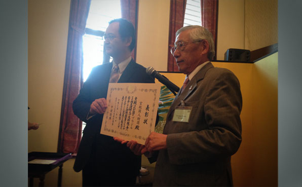 Dr. Roberto Nishio (dir) recebe o diploma de reconhecimento das mãos do Cônsul Geral, Sr. Takahiro Nakamae: “(…) solicitamos e contamos desde já com a valiosa orientação e apoio de Vossa Excelência e do Consulado Geral do Japão em São Paulo.”