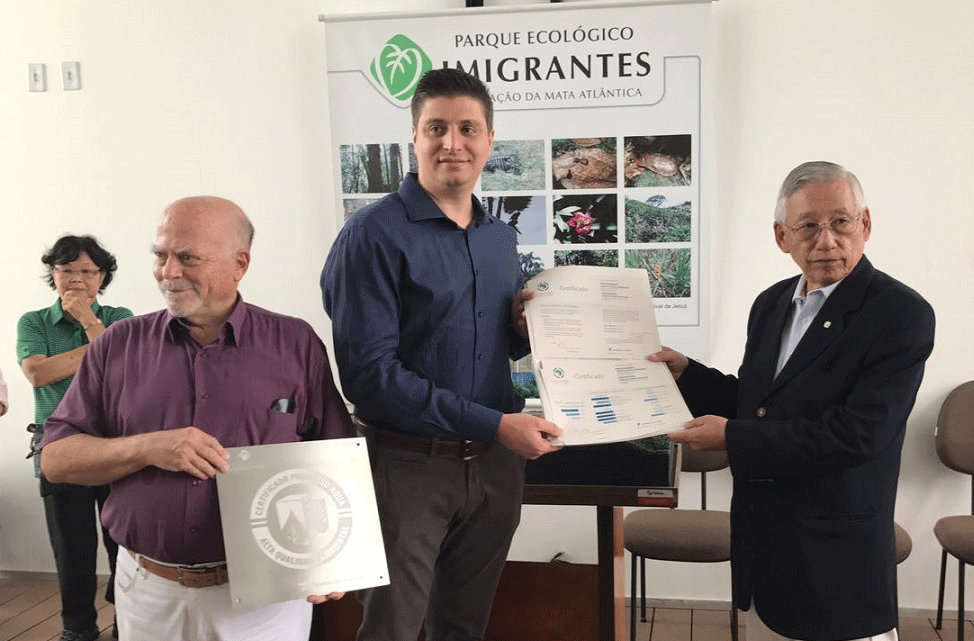 Muito orgulho. Com certeza esse foi o sentimento de todos os presentes na cerimônia de entrega do Certificado AQUA-HQE, que aconteceu no dia 04/03/2017, feita pela Fundação Carlos Alberto Vanzolini à Fundação Kunito Miyasaka, por mais uma fase concluÃda do Parque Ecológico Imigrantes: sua concepção. A FKM já havia recebido a primeira certificação quando da conclusão da fase Projeto, mas a emoção foi bem diferente – a cerimônia foi realizada no Portal de Atendimento do parque, e muitos dos profissionais envolvidos no perÃodo de obras, caminharam lado a lado pela área construÃda e admirando a beleza da Mata Atlântica. Além dos representantes das duas entidades, o evento foi prestigiado pelos engenheiros da coordenadora da obra – ARC, pela consultoria de certificação – Inovatech, pelo bioconstrutor responsável pelas trilhas – RTF, e pelo Comitê Executivo e equipe administrativa do Parque Ecológico Imigrantes.